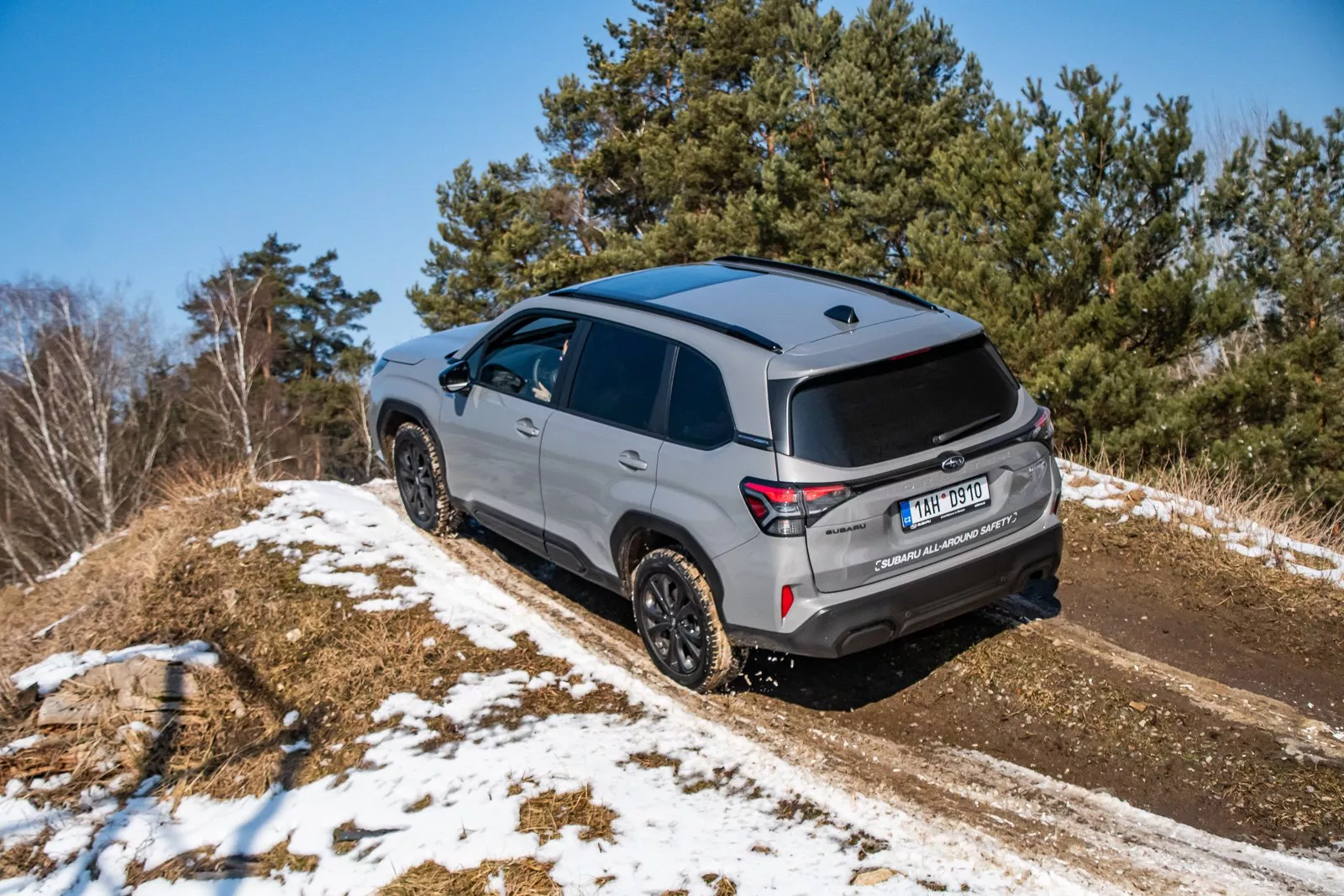 A navíc se Forester tradičně nebojí ani terénu. Nová generace má vylepšený terénní režim X-Mode (funguje i při couvání). V kombinaci se světlou výškou podvozku 220 mm a systémem pohonu všech kol to znamená možnost vypravit se i dále mimo zpevněné cesty. Mimochodem, čtyřkolka má nové nastavení. Zatímco dříve motor poháněl obě nápravy rovnoměrně, takže standardní poměr byl 50/50, u nové generace je to 60/40 ve prospěch přední nápravy. Více předokolkový charakter napomáhá stabilitě.