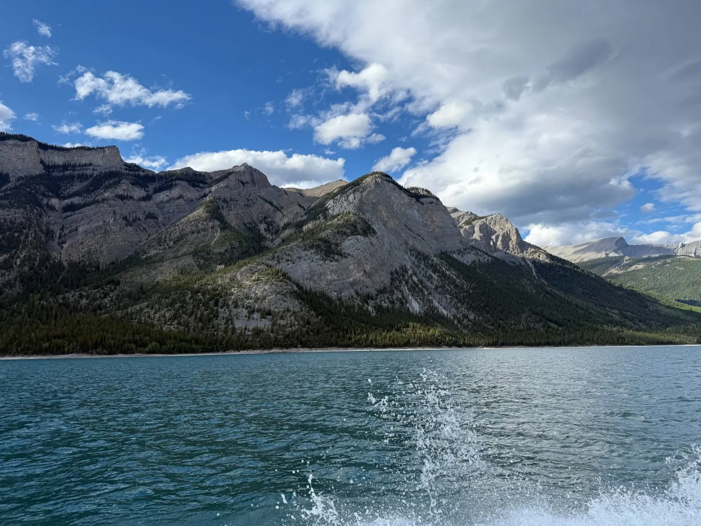 První zastávka: jezero Lake Minnewanka. Jméno, které zní jako z kresleného filmu a výhled, který by klidně mohl být screensaverem. Tyrkysová voda, hory v pozadí, občasná loďka, co vypadá, že pluje po barvě.