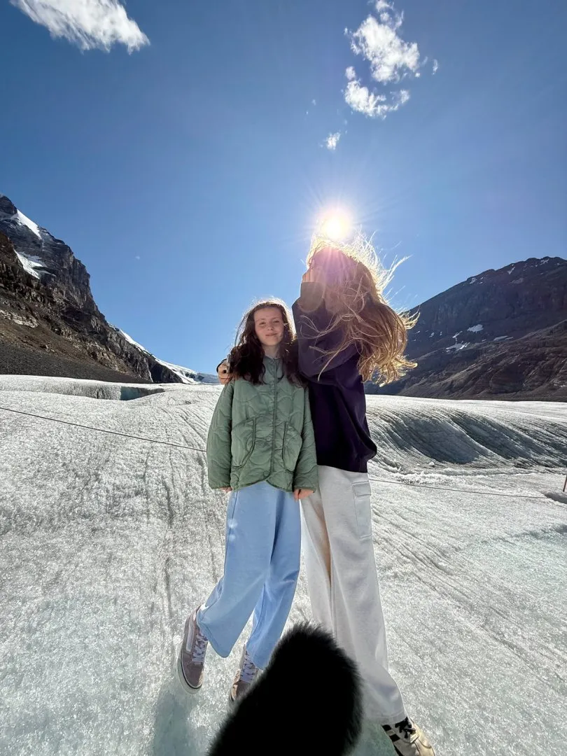 Autobus nás vyvezl přímo na led, a tam se teplota během pěti vteřin změnila z „léto v Banffu“ na „zima v Kanadě“. Fotr samozřejmě okamžitě zkoumal motor autobusu, zatímco my jsme se snažili nefotit jen sebe, ale i ten neskutečný prostor. Lumi šla s námi a vypadala, jako by se vrátila domů, sníh, klid, mráz, ideální kombinace pro fenku, která se jmenuje podle finského slova pro sníh.