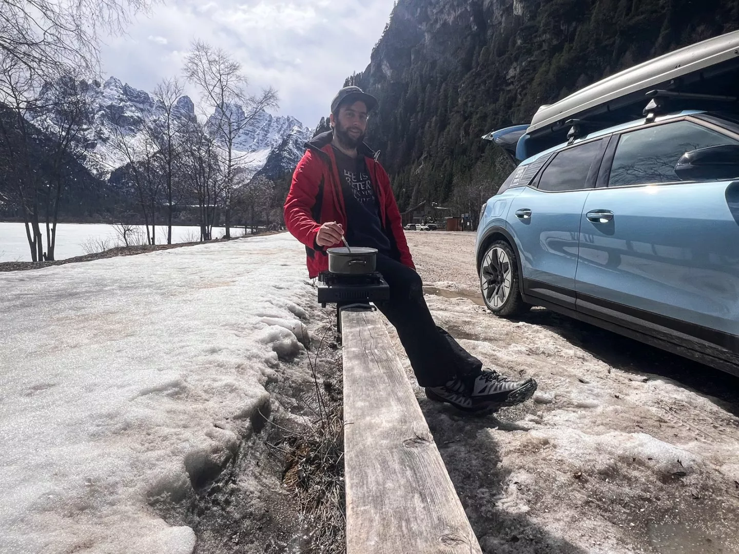První den jsem dojel do vesnice Villabassa. Cesta byla úplně v pohodě, nabíjení víceméně podle plánu, ale v kempu v téhle vesnici předpověď slibovala jednu noc mínus osm a druhou dokonce mínus deset. Původně jsem si myslel, že bych přespal v autě, jenže tak velký tenhle Explorer není. Vzal jsem si spacák s teplotou přežití -10 °C (neplést s komfortní teplotou!) a dal jsem to tedy ve stanu. V takovéto zimě jsem ještě nikdy nestanoval, ale nakonec to bylo relativně v pohodě. Jen bylo potřeba být zakuklený ve spacáku opravdu poctivě. Jakákoliv netěsnost nebo jen trochu vystrčená ruka znamenala okamžitý trest v podobě ledového průvanu.