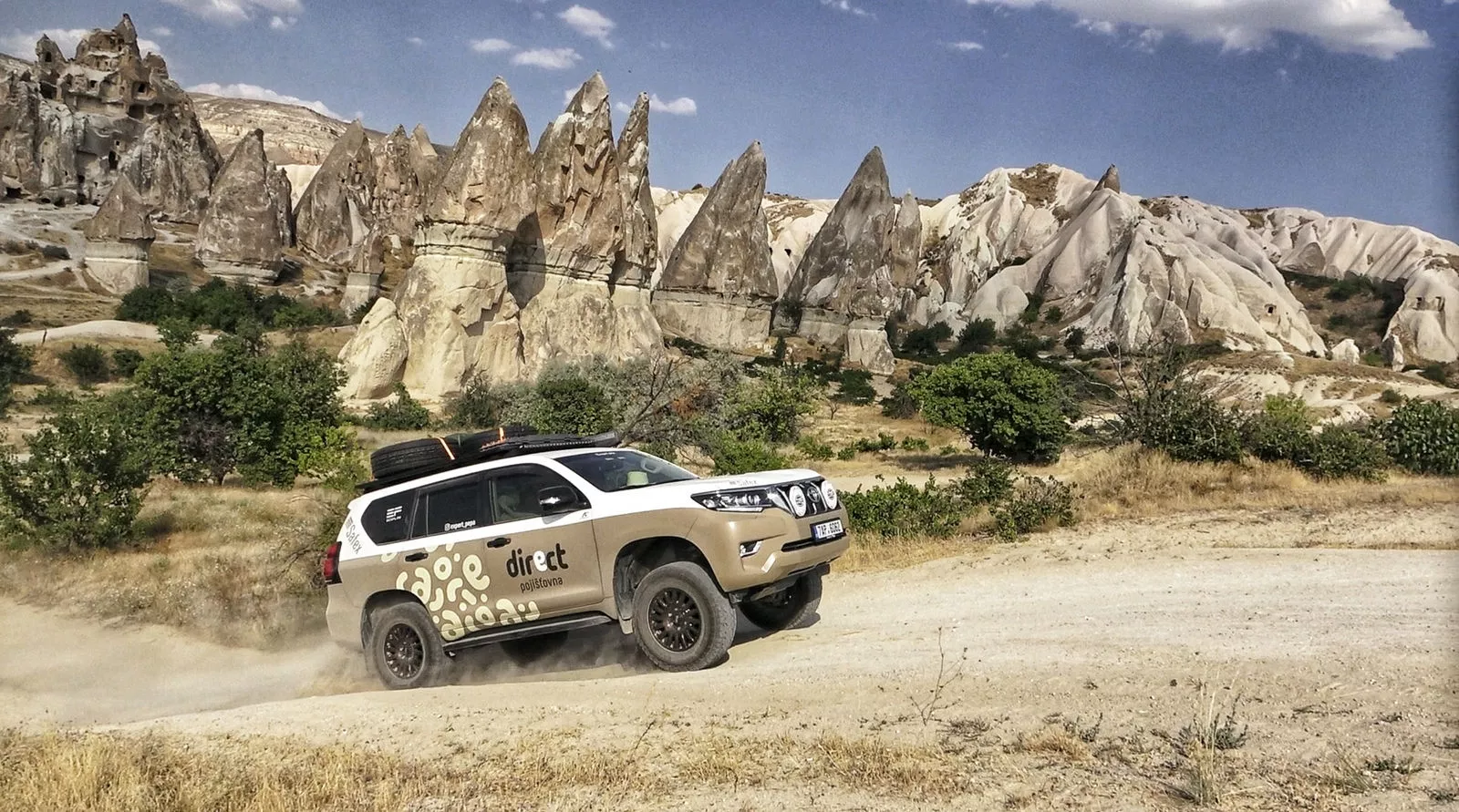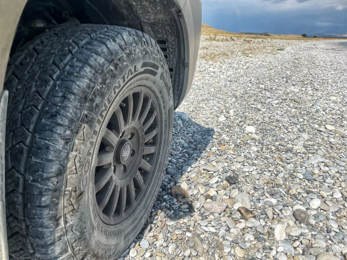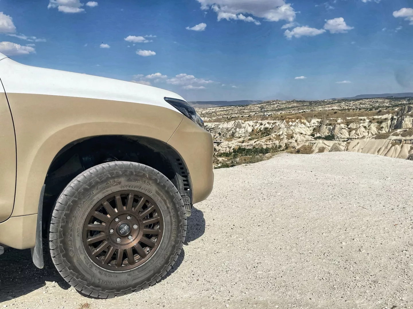 Před cestou bylo jasné, že půjde o kombinaci klasických a nezpevněných cest v poměru cca 80 na 20. Přičemž ty nezpevněné, vzhledem k destinaci, neměly být bláto, spíš vyprahlá krajina pouštního charakteru nebo step. Pneumatiky na toyotě i karavanu jsou proto značky Continental CrossContact ATR se zesílenou nosností a nízkou hlučností při jízdě na běžné silnici, zároveň ale s výbornou trakcí na všech typech terénu, kam ale neřadíme ten opravdu extrémní, kterému se díky zapřaženému karavanu, hmotnosti soupravy a bezpečnosti, třeba v Iráku, musíme vyhnout.