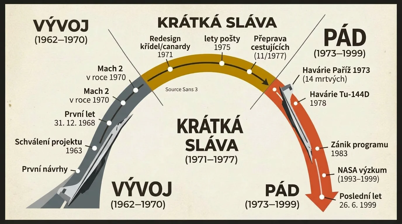 Prototyp vzlétl 31. prosince 1968, takže se do vzduchu dostal dřív než Concorde. Na pravidelný let s cestujícími si ale musel počkat až do 1. listopadu 1977, kdy odstartoval spoj do Alma-Aty, dnešního Almaty v Kazachstánu. - Proč provoz Tu-144 skončil tak rychle?