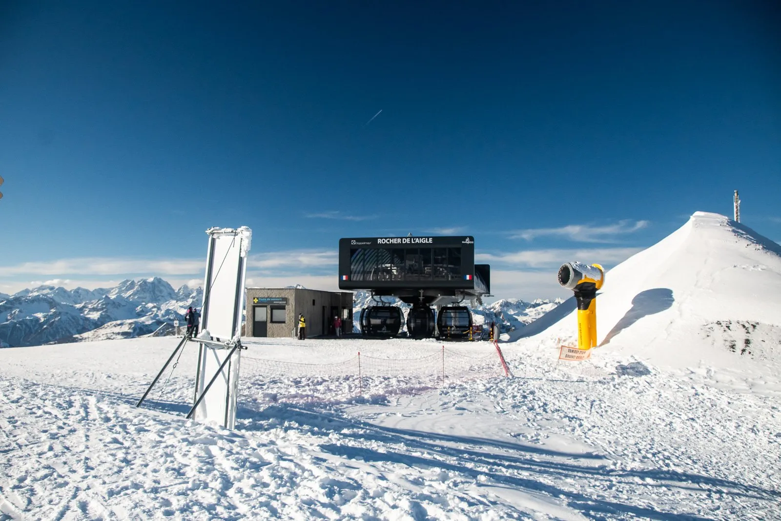 Pokud bych měl vybrat tu jednu jedinou sjezdovku ze všech, které jsem během týdenního lyžování tady v těchto horách navštívil a která byla tou nejhezčí, bude to právě tahle. Lanovka Rocher de l'Aigle je poměrně nová. Nahradila původní starší sedačku, fungovat začala v zimě 2023/2024 a vytáhne vás až do výšky 2600 metrů nad mořem přesně na hranici Itálie a Francie. Na jedné straně se vám nabízí fantastický výhled na vrchol Le Chenaillet a navazující horský hřbet, který tuhle část odděluje od části areálu pod Sommet des Anges, na druhou stranu máte výhled na Colle Bercia. To je vrchol vedlejšího areálu Cesana-Claviere, přičemž odsud ho pozorujete kdesi dole pod sebou. Už jen samotný výhled do okolí je tady fakt skvělý.
