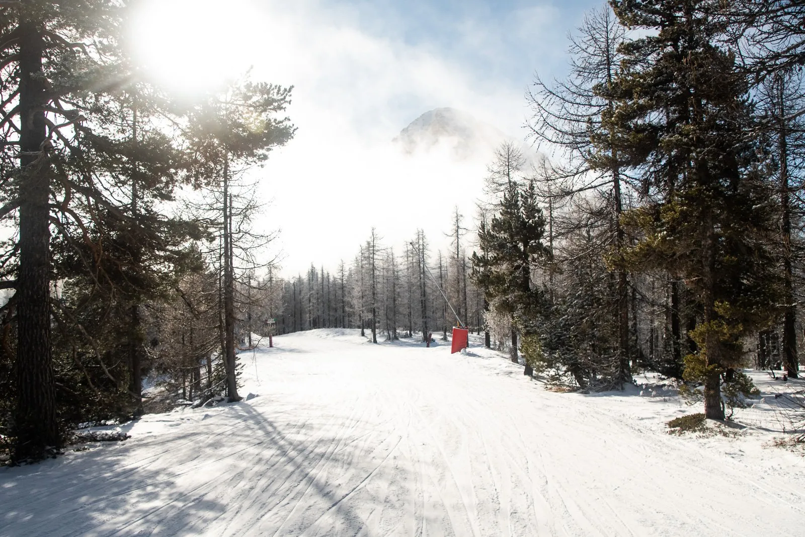 Trochu těžší a většinou červené sjezdovky jsou pak kolem dvoutisícového vrcholku Prarial. Vedou lesem a moc lidí tady nejezdí. Všichni samozřejmě míří vzhůru, stejně jako já.