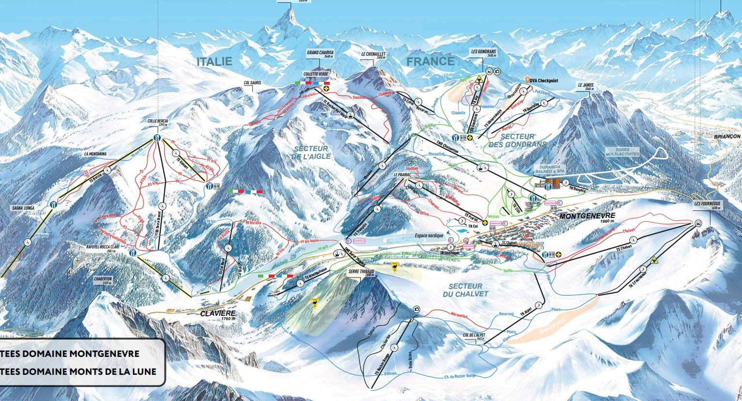 Skiareál Montgenèvre leží západně od Turína přímo na hranicích Itálie a Francie. Hned vedle je italské menší středisko Claviere, které je s Montgenèvre propojené a přes které se z francouzského střediska můžete pohodlně dostat na celou Vialattea, což je dalších 400 km sjezdovek tak různě kolem městečka Cesana Torinese.