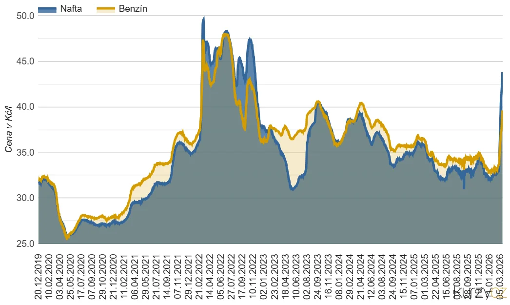 Jenže dnes jsme v přesně opačné situaci. Lidé jezdí autem, všechno tak nějak běží, ale problémy na Blízkém východě komplikují produkci ropy a její cena rychle roste. Což se odráží také na cenách paliv. Dostáváme se tak do podobné situace, jako jsme byli v roce 2022 po vypuknutí války na Ukrajině, kdy cena nafty krátkodobě vystřelila na 50 Kč za litr.