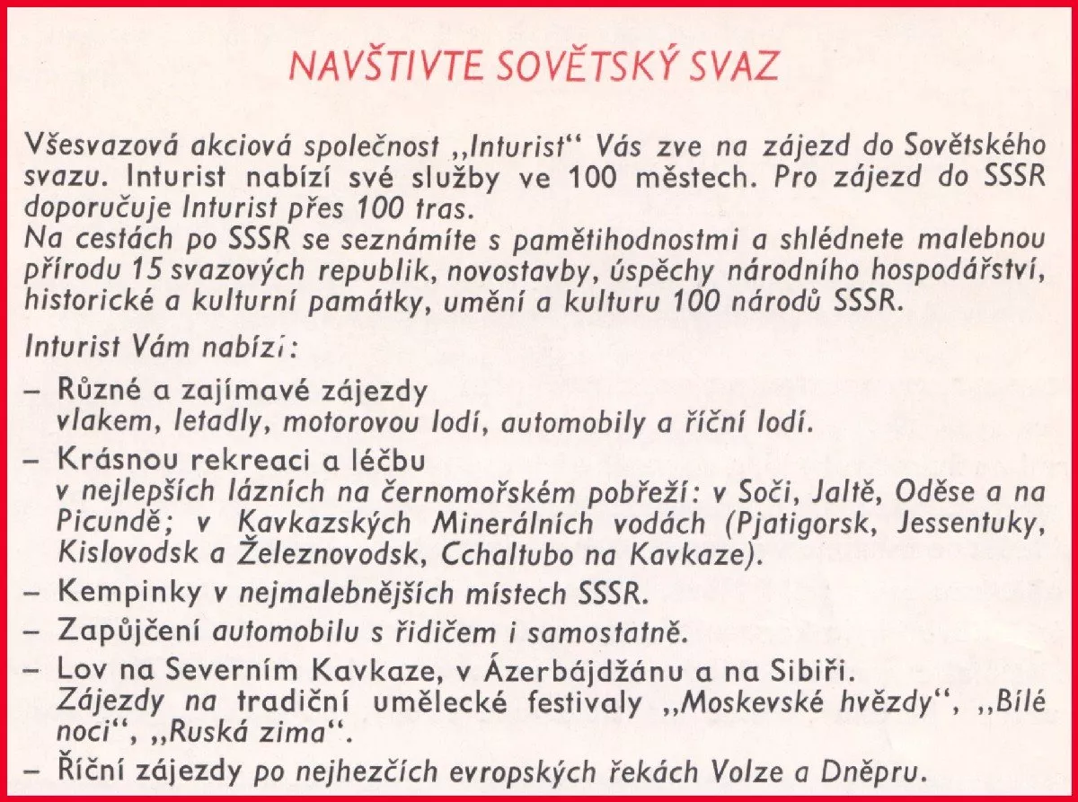 Zájemci o vycestování třeba do Moskvy museli splnit řadu věcí a museli se smířit s tím, že budou pod drobnohledem státního aparátu. Při cestě autem byla předem pevně daná trasa i počet kilometrů, které bylo dovoleno ujet za jeden den. Na hranicích byly dlouhé fronty a prakticky všechno zařizovala jediná turistická kancelář. No prostě to nebylo vůbec jednoduché.