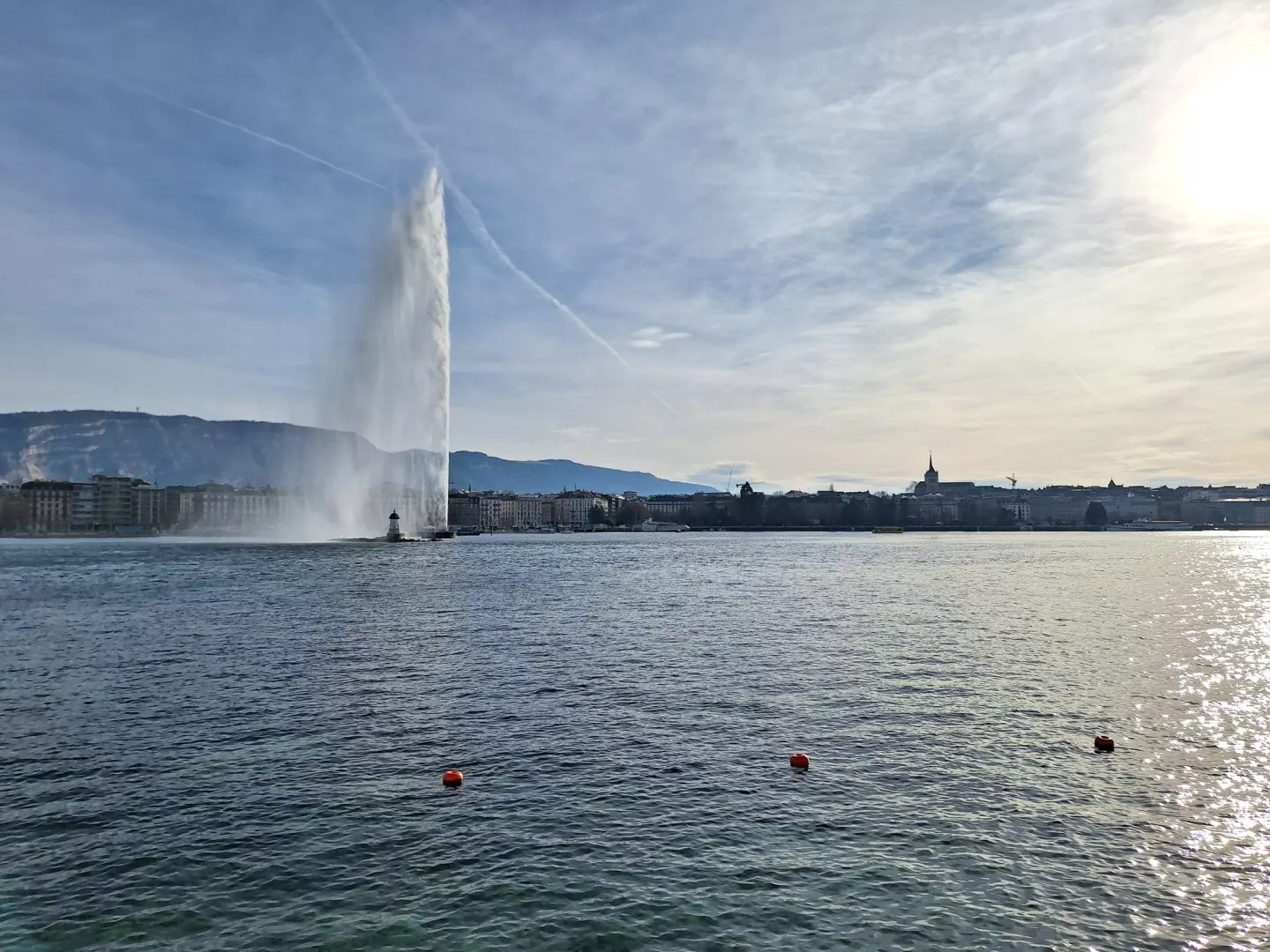 Po skvělém jídle mé kroky vedly na zmiňovanou promenádu kolem jezera, která je známá také jako Quai du Mont-Blanc a je jedním z nejkrásnějších míst v Ženevě, nabízející malebné výhledy na samotnou vodní plochu a okolní Alpy. Je lemována stromy, květinovými záhony a sochami a na jejím konci, který je umístěn blíže k městu, se nachází Jet d'Eau, jedna z nejvýznamnějších pamětihodností města. Jedná se o impozantní vodní fontánu, vystřelující vodu do výšky až 140 metrů. Kromě toho, že je viditelná z nespočtu míst ve městě, je též pro ženevany jakýmsi jejich symbolem.