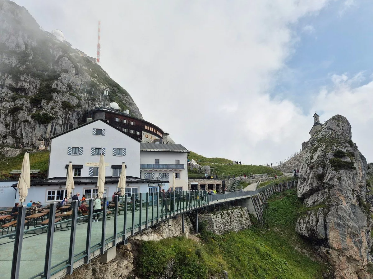 Vzhledem k přítomnosti okolní mlhy jsme se rozhodli, že si místo výstupu na vyhlídku ještě o pár výškových metrů výše raději dáme oběd ve zdejší táckárně. Currywurst s pivem nám ve výšce 1730 m n. m. chutnal a po pár vrcholových fotkách se vydáváme opět jinou cestou dolů. Hned se ale musíme zastavit, protože slyšíme z tunelu blížící se vláček, kterým se sem můžete nechat vyvézt z městečka Brannenburg. Jedno zahoukání a jedno rychlé foto a pokračujeme v sestupu, jsme nyní teprve v polovině výletu.