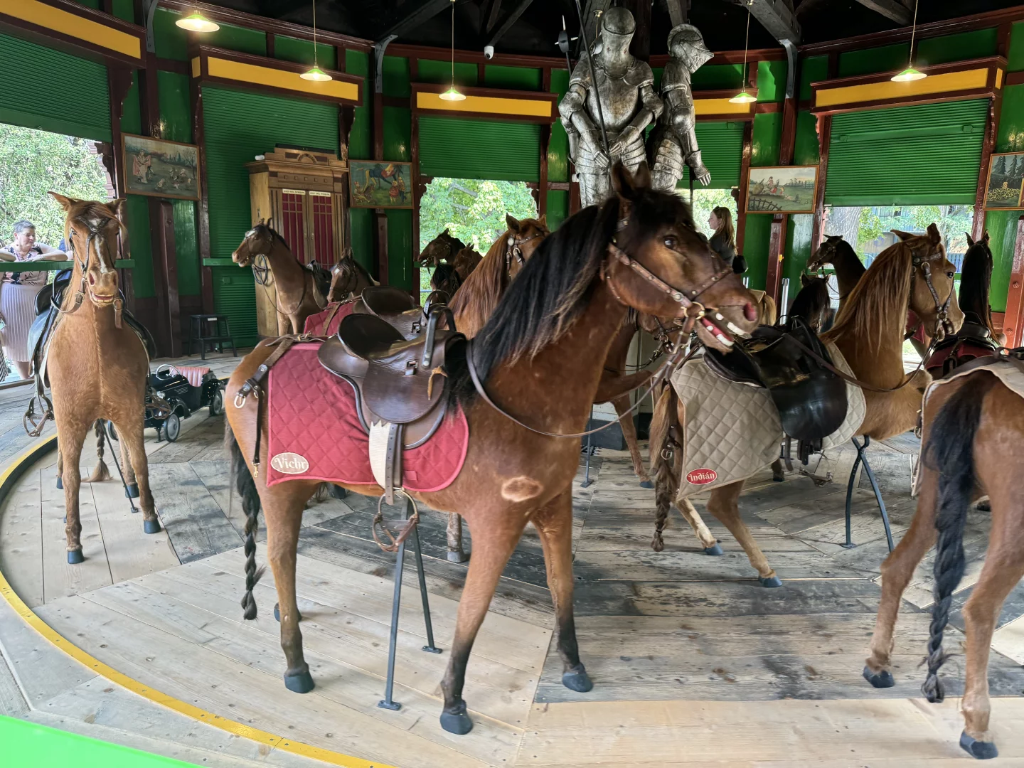 Dřevěný pavilon, který kolotoč ukrývá, má tvar pravidelného dvanáctiúhelníku. I z venku lze obdivovat novorenesanční architekturu. Při nakouknutí dovnitř se vrátíte o několik století zpět - čas jako by se uvnitř zastavil. Uprostřed altánu stojí tři rytíři v brnění a na kolotoči figuruje několik koní. Pro děti jsou tu ještě malá autíčka. Všechny figury koní jsou potažené pravou koňskou kůží, která jim dodává na autentičnosti. Jejich výraz může někomu (nám) připadat trochu děsivý. Pokud se však přes tuto skutečnost dokážete přenést, pak si při jízdě na jednom z koní užijete několik minut za doprovodu orchestrionu. Ten původní se sice nedochoval, ale poctivě tu slouží lipský orchestrion z roku 1910.