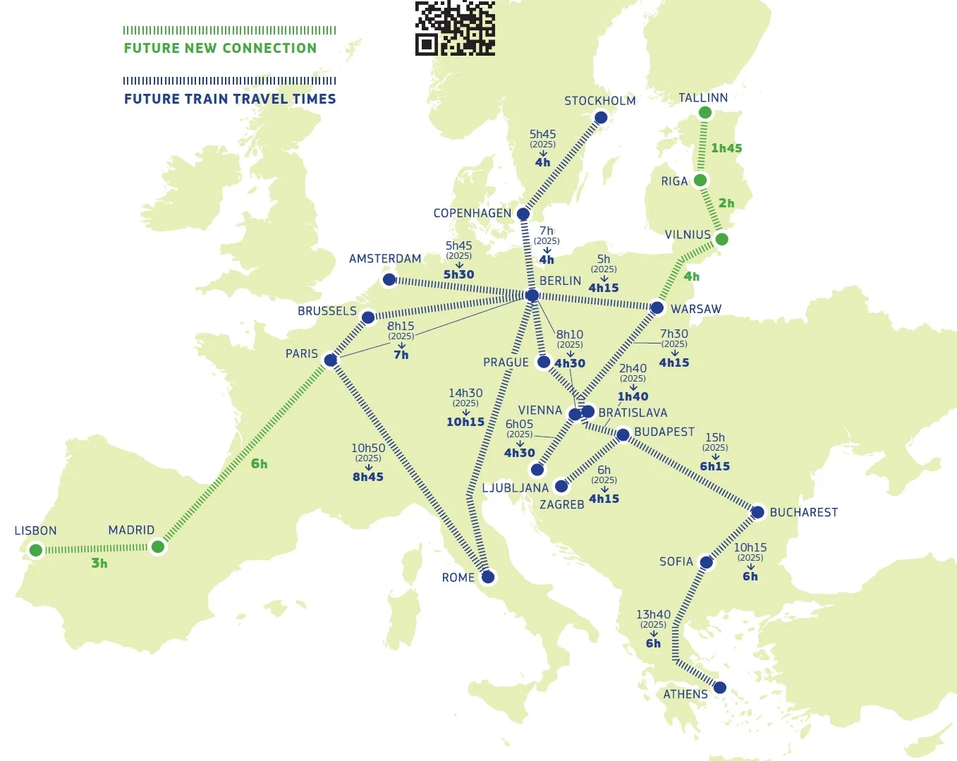 Evropský dokument naznačuje i cílové časy cesty mezi evropskými městy. Základní představu dá mapa v úvodu článku (v plném rozlišení ji najdete zde). Podle této mapy třeba cesta z Vídně do Lublani potrvá místo současných více než šesti hodin jen 4,5 hodiny. Z Vídně do Berlína by to mělo být také 4,5 hodiny, přičemž dnes taková cesta zabere přes osm hodin. Kromě toho se chystá i výstavba nových tratí. Ty by měly spojit Paříž s Madridem a Lisabonem a na severu Varšavu, Vilnius, Rigu a Tallin.