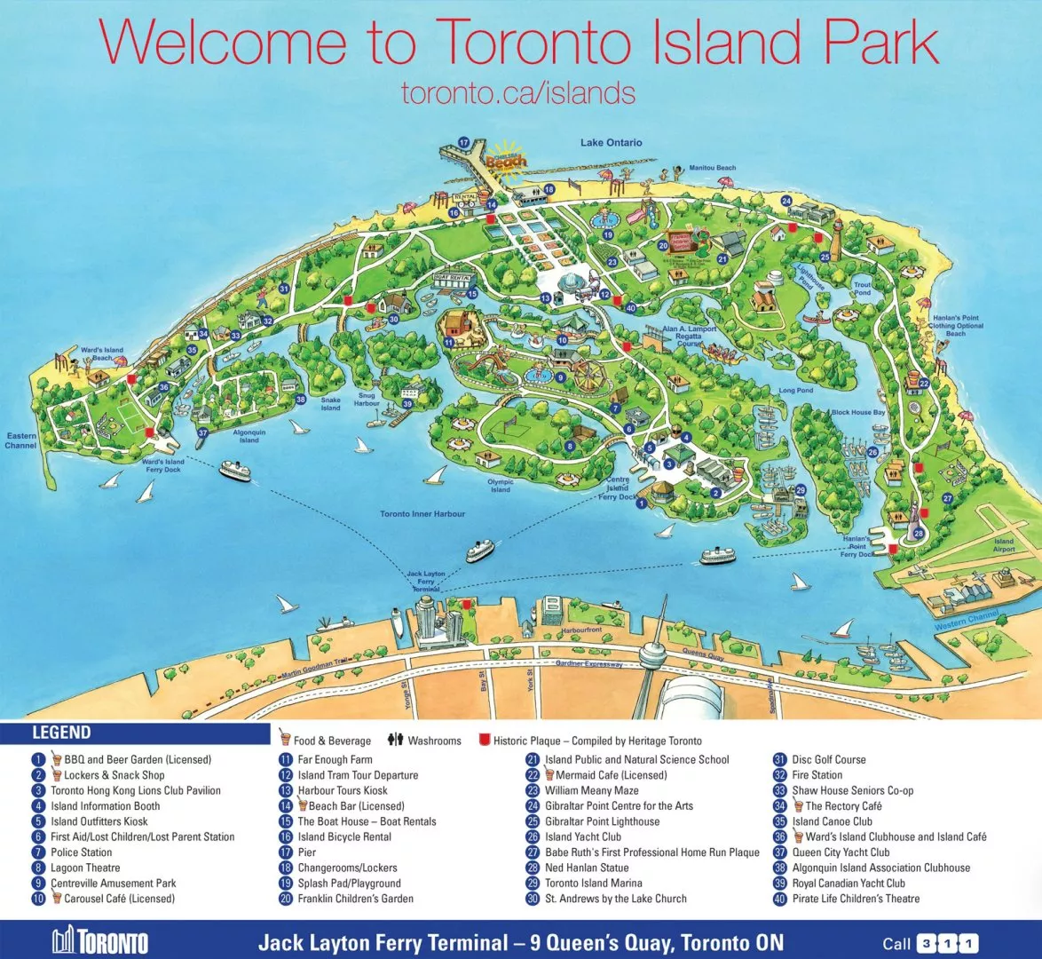 Toronto Islands je souostroví hned naproti centru města. Původně to byl jeden poloostrov, ale v roce 1858 přišla silná bouře a napojení na pevninu prostě odplavilo. Tak vznikl ostrov – náhodou. Dnes je to síť propojených ostrůvků, na které se nedostanete autem, jen lodí, a kde najdete všechno od písečných pláží až po malý zábavní park. Tady nehučí auta, jen rackové a občas někdo, kdo si zapomněl opalovací krém.