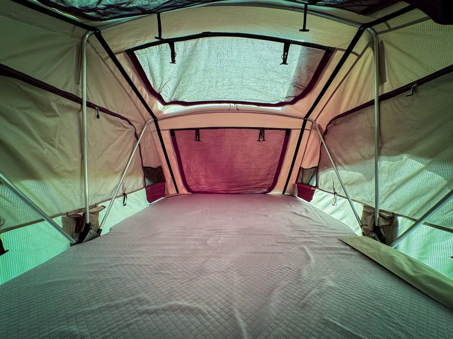 Jakmile je stan rozložený, zbývají už jen jednoduché úkony, jako zasunout kovové výztuhy na své místo, a postupně se ze stanu stává bytelné obydlí. Ještě ho ukotvit k zemi, natáhnout plachtu proti dešti a je hotovo. Dovnitř se pak leze právě po žebříku. Překvapilo mě, kolik místa se uvnitř nachází. Pohodlně se tu vyspí dva dospělí lidé a v nouzi klidně i jejich dítě. Jen si nesmíte zapomenout doma deku s polštáři.