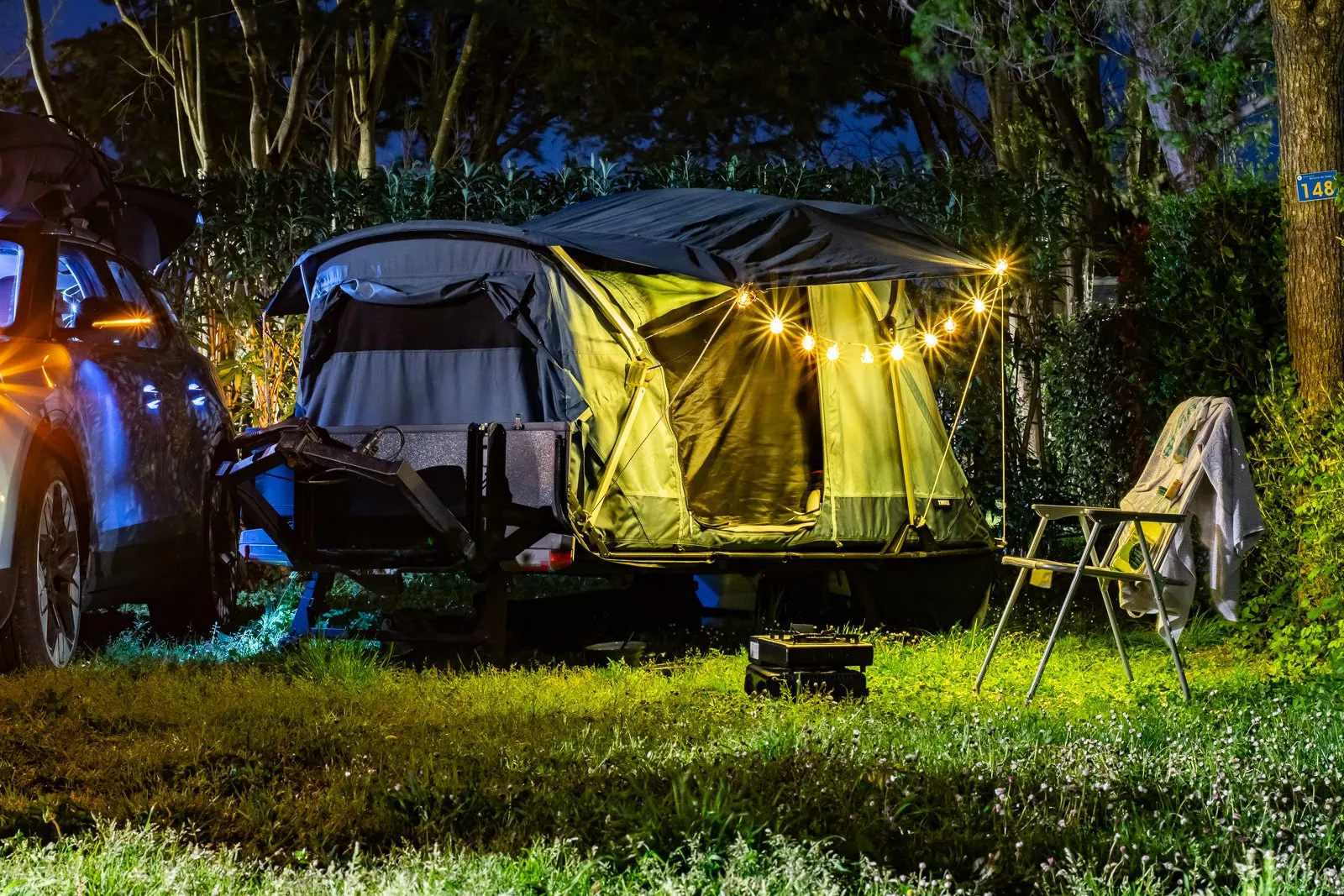 V každém případě krabice za autem nenarušuje aerodynamiku, takže nezvyšuje hluk. A nezvyšuje spotřebu, což je hlavně u elektromobilů velmi důležité. Ostatně, pro elektrická auta tahle věc vznikla. Při naší cestě po Evropě hluk zvyšoval střešní box a surf na střeše, ale bez těchto věcí se jezdí se stanem opravdu super. Mimochodem, právě možnost dát na střechu větší předměty a zároveň mít na autě přidělané spaní je další výhodou.