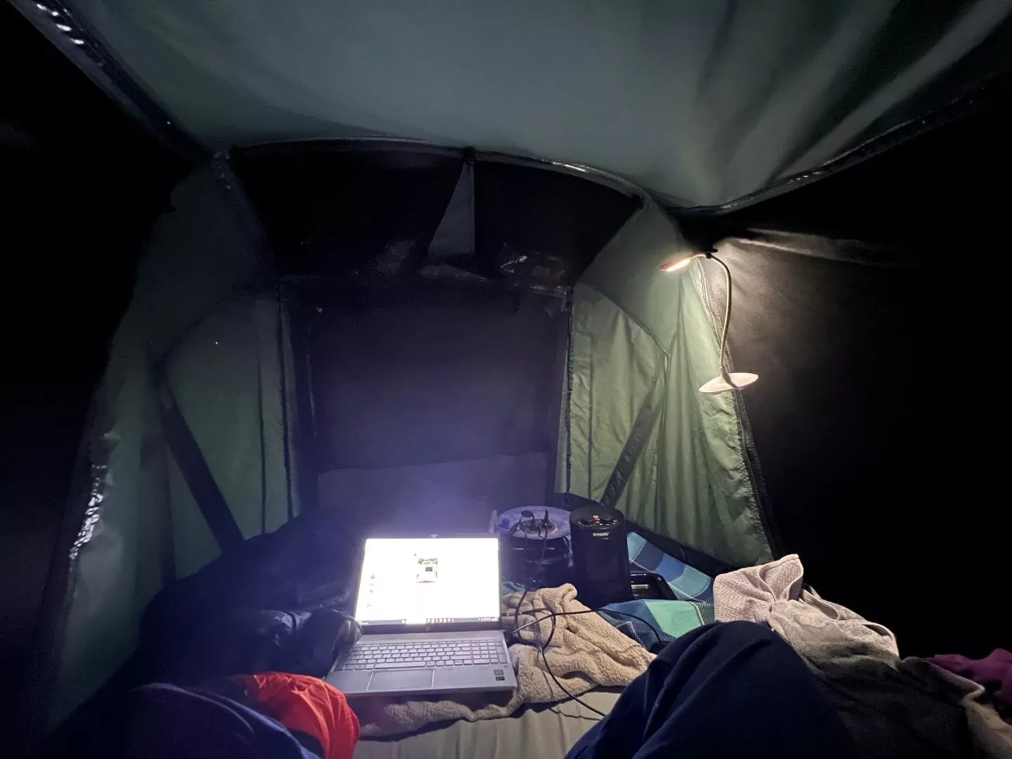 Hodí se doplnit, že do stanu se špína během jízdy nemá šanci dostat. Jednak kvůli tomu, že je postel zabalená uvnitř a že vnější strana podlahy slouží jako vnější ochrana, ale také díky té krycí plachtě. Při cestě stan zažil úplně všechny podmínky od velkých louží přes prach až po deštivé přesuny po dálnicích, žádné nečistoty (kromě těch, co jsme si tam nanosili sami) se do stanu nedostaly.